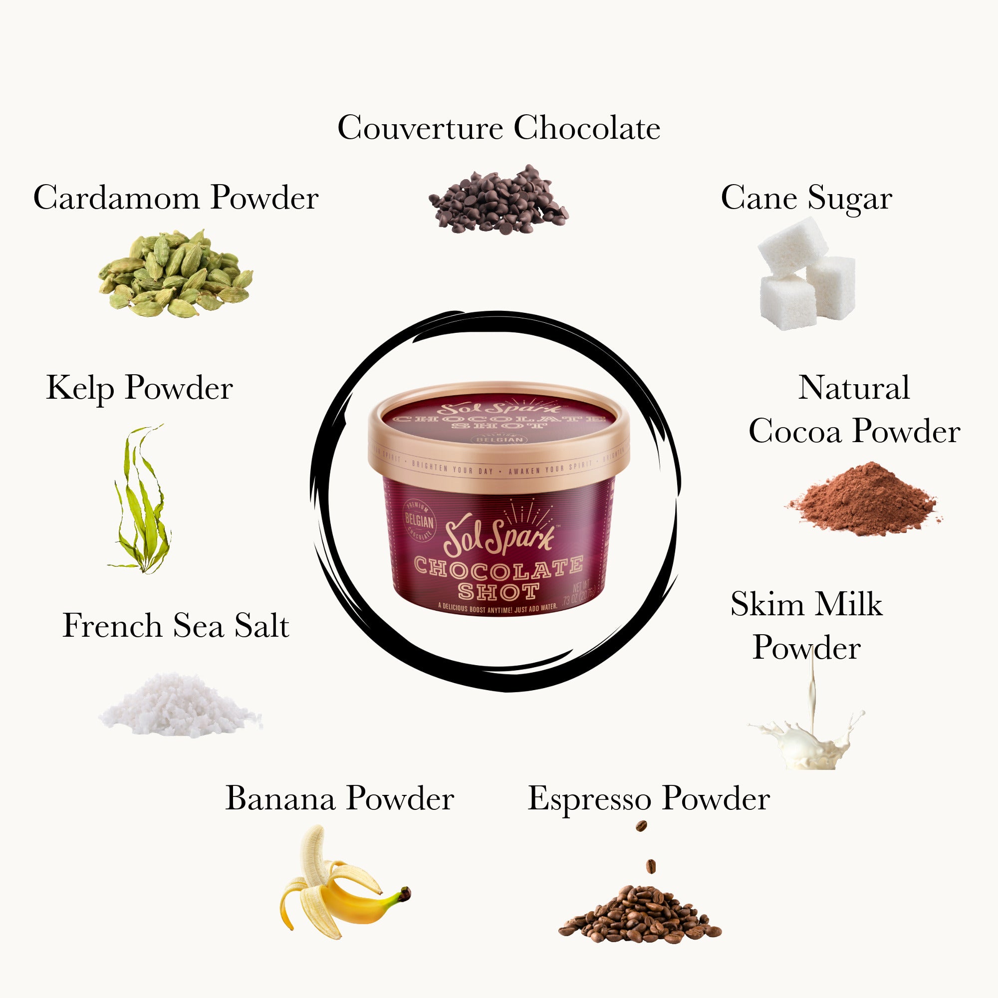 SolSpark Chocolate Shot uses the umami in organic kelp powder to balance the bitterness of espresso powder and compliment the richness of the cocoa butter