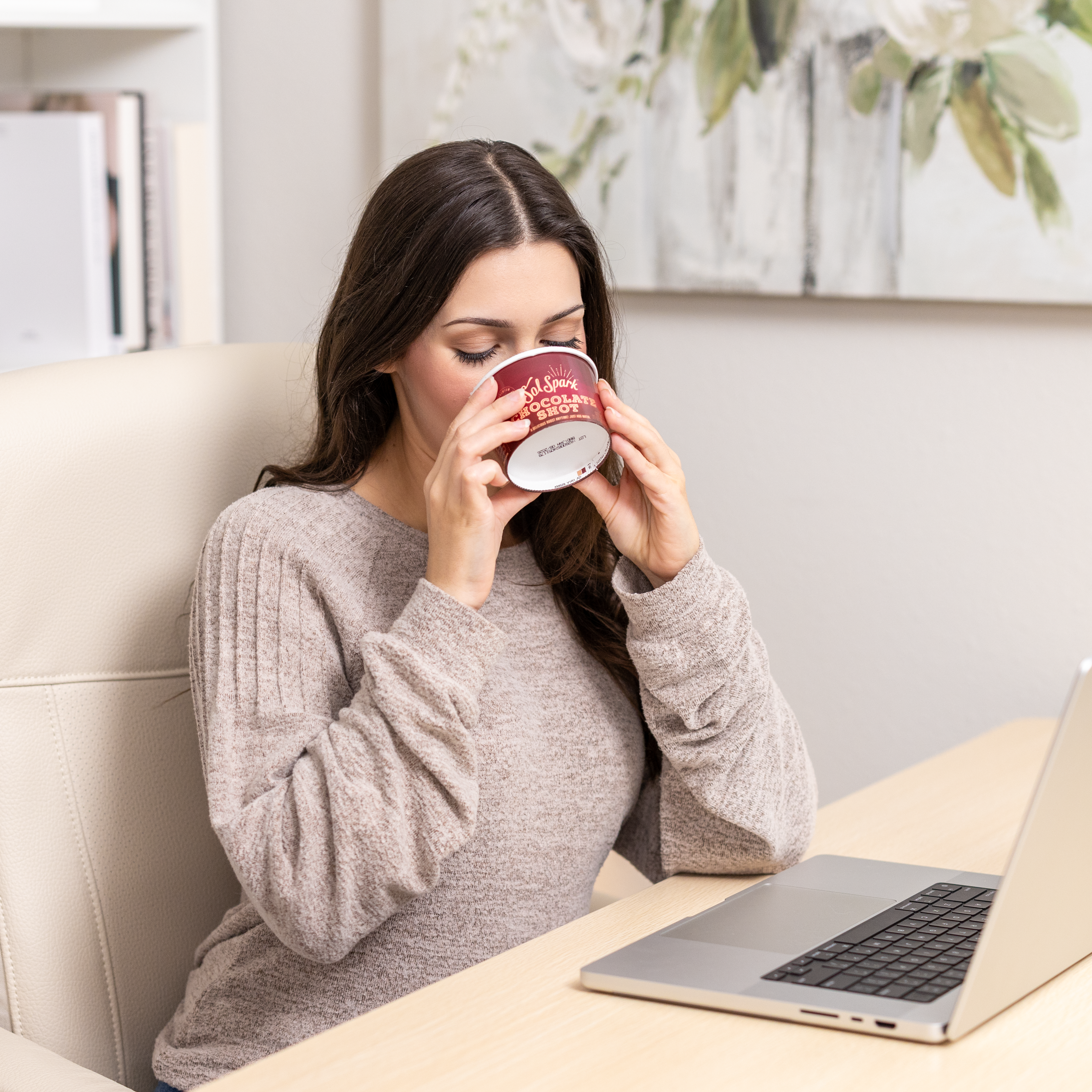 SolSpark Chocolate Shot: a moment of joy born from necessity. Needing a better pick-me-up, one day on a whim in the office pantry, we melted chocolate in a shot of hot espresso. The drink lifted our spirits and transformed our day. We were so impressed with the result that we spent over 2 years perfecting it, sourcing the world's finest ingredients to transform a simple drink into a spectacular experience. It's a small indulgence that brightens your day.